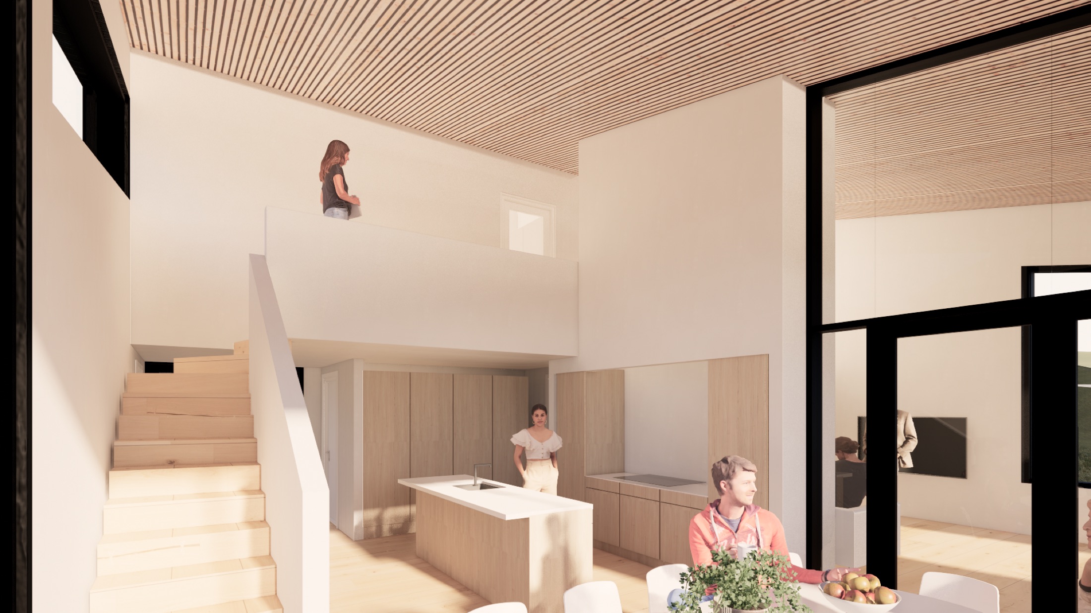Centralt køkken – Husets hjerte Når du træder ind i huset, mødes du af en indbydende åben trappe, der fører op til overetagen, hvor husets centrale rum – køkkenet – er placeret.